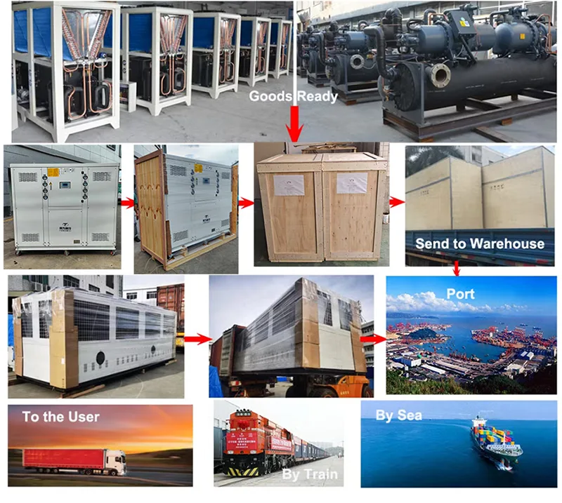 Jako profesjonalny dostawca i eksporter agregatów wody lodowej dysponujemy własnym spedytorem, który organizuje wysyłkę. Nasza agregat chłodniczy jest wyposażony w opakowanie ze sklejki, które zapobiega uszkodzeniom podczas transportu i spełnia standardy eksportowe. Istnieją trzy sposoby dostarczenia agregatu chłodniczego: